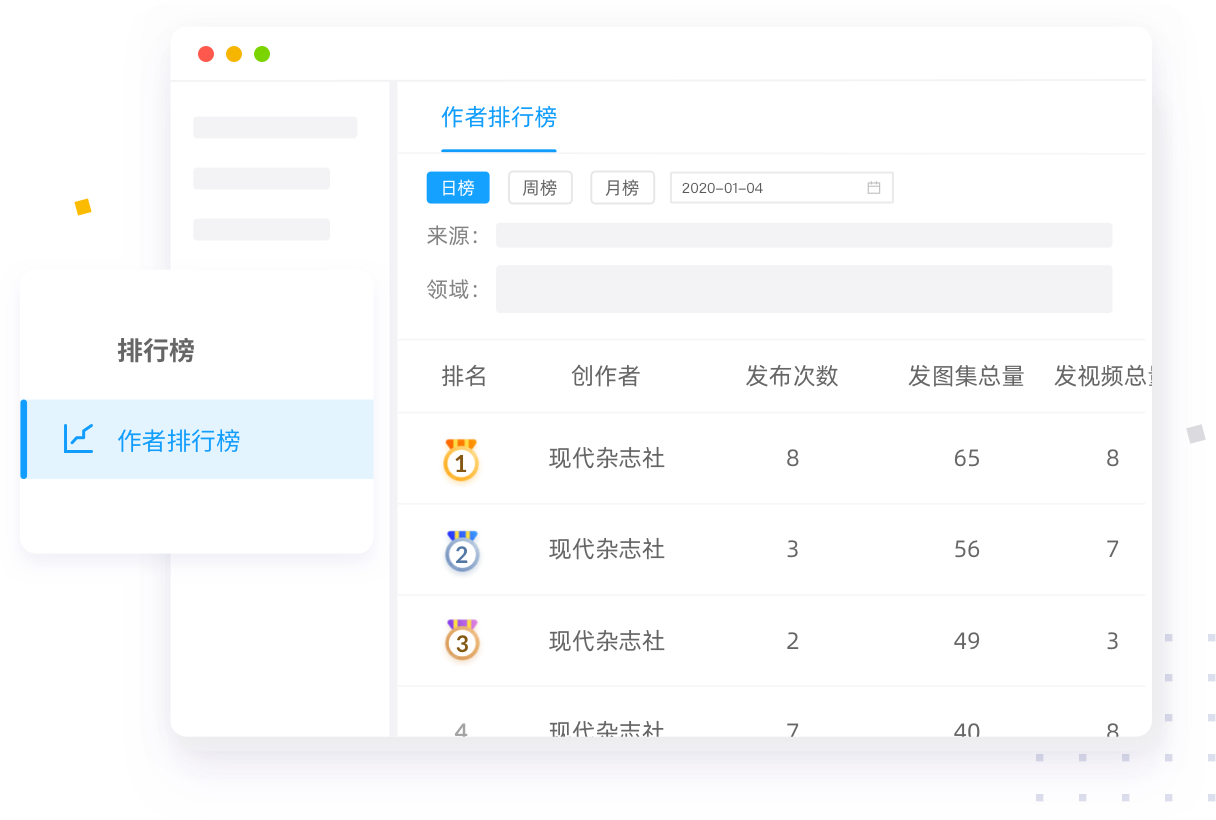 使用场景:各大自媒体平台作者排名数据查询 16大热门自媒体平台作者榜单信息,以日榜、周榜、月榜的形式展示,帮助创作者了解作者排名情况
