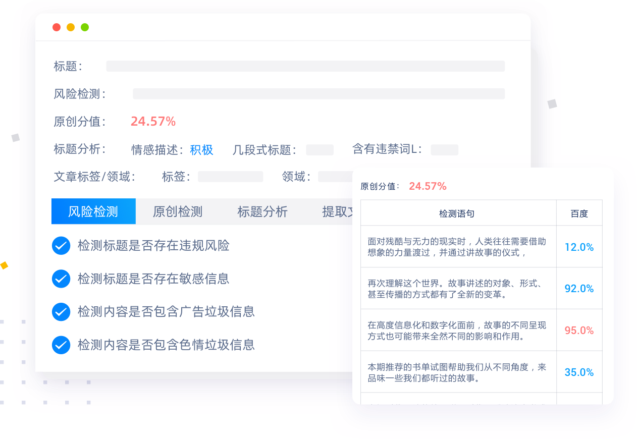 使用场景:文章质量综合检测:文章原创度检测、标题质量检测、降低文章风险值、文章发布领域参考、引导提高文章质量 通过视界大数据及各大搜索平台、自媒体平台数据,判定原创值、风险值、标题风险等,进行质量评定并给予建议发布的平台和领域推荐