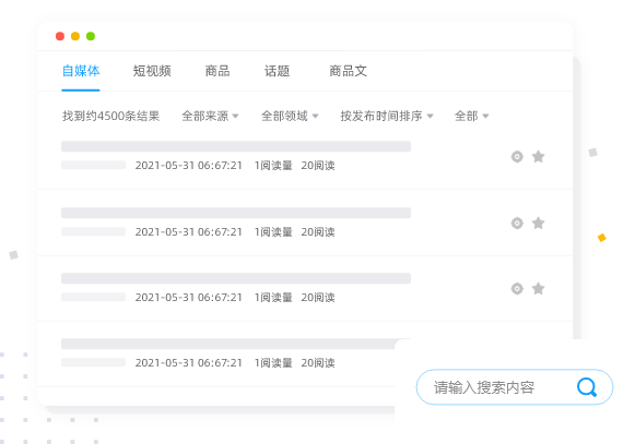 使用场景:新媒体短视频、图文、图集内容跨平台聚合搜索,覆盖头条、大鱼、抖音、快手等30+主流平台。多维度精准搜索,一键触达。