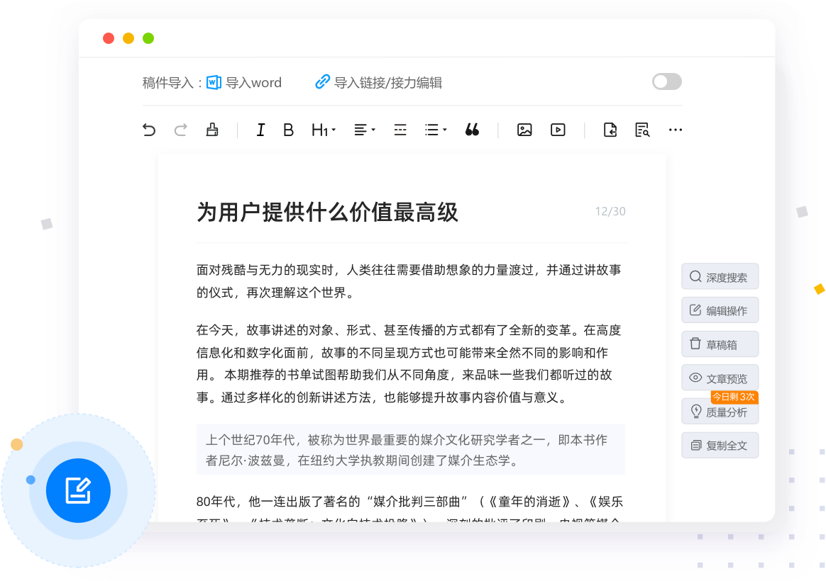 使用场景:文章内容编辑排版 优化内容排版,提升用户阅读体验、提高文章质量